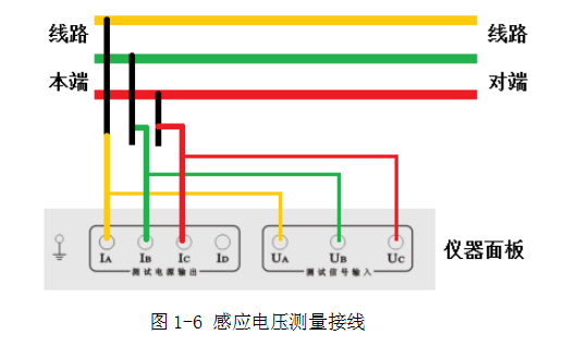 測(cè)試兩條輸電線路間的互感時(shí),被測(cè)線路測(cè)量端和對(duì)端三相分別短接,對(duì)端接大地,將儀器輸出A和電壓測(cè)量端子UA分別接入被測(cè)線路1和被測(cè)線路2的測(cè)試引下線,如圖1-17和1-18。